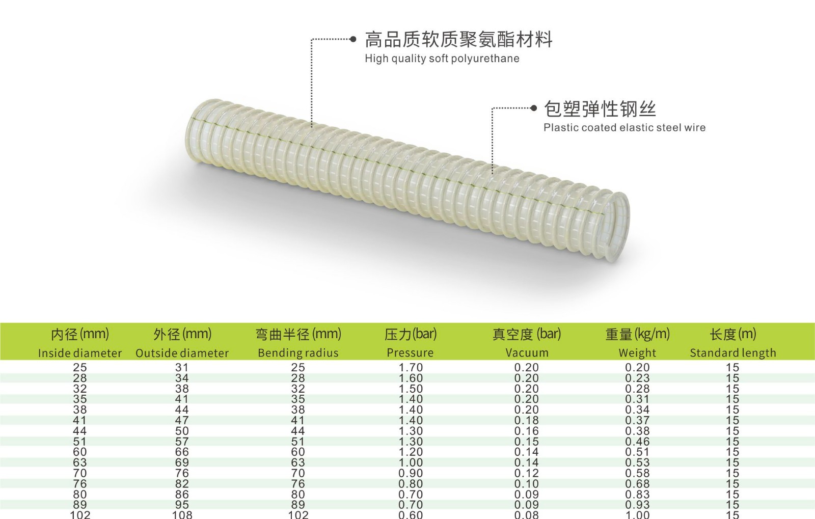 柔软PU管壁,内嵌螺旋钢丝加强,纤维增强。耐油、耐化学性、耐温、超级柔软,具有非常高的抗拉强度;柔软,内壁平滑,易于操作。