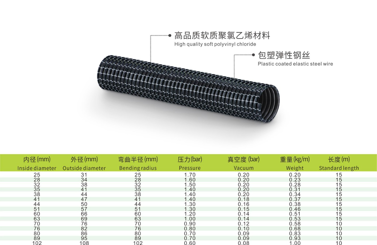 柔软PVC管壁,有轴向和径向纱加固,内嵌包塑螺旋钢丝加强,柔软,内壁平滑,坚固,易于操作,具有良好的耐磨性UL94-HB阻燃级别。