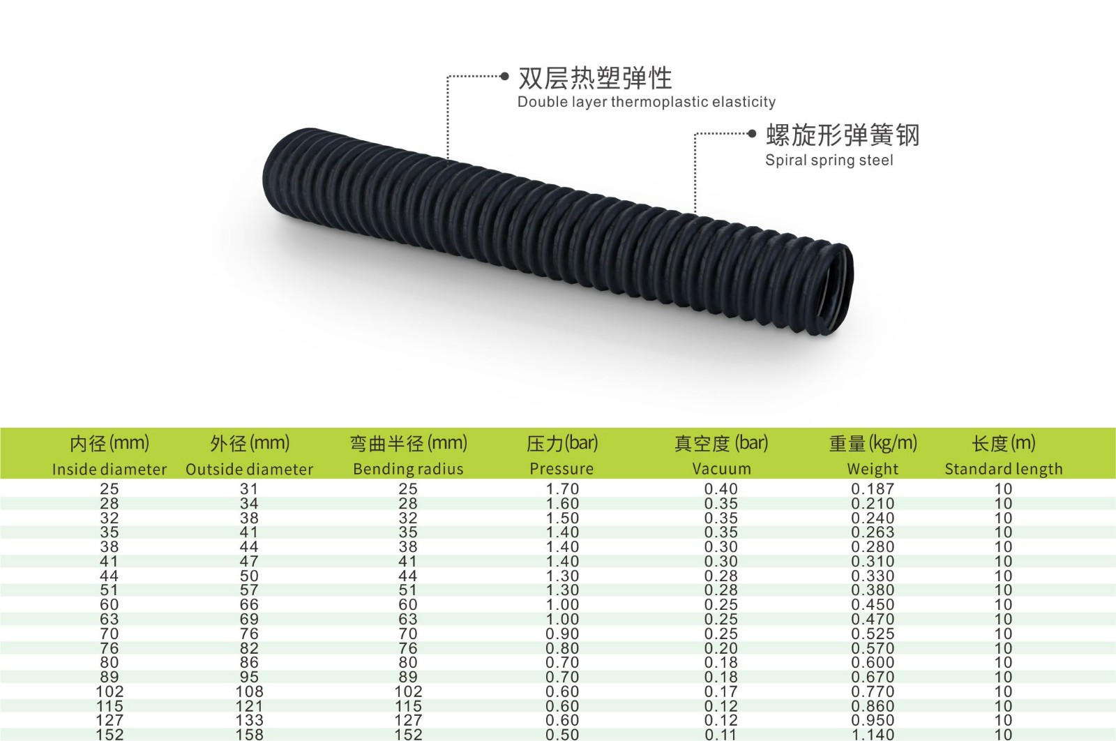 柔软TPE管壁,有轴向和径向纱加固,内嵌包塑螺旋钢丝加强,柔软,内壁平滑,坚固,易于操作。