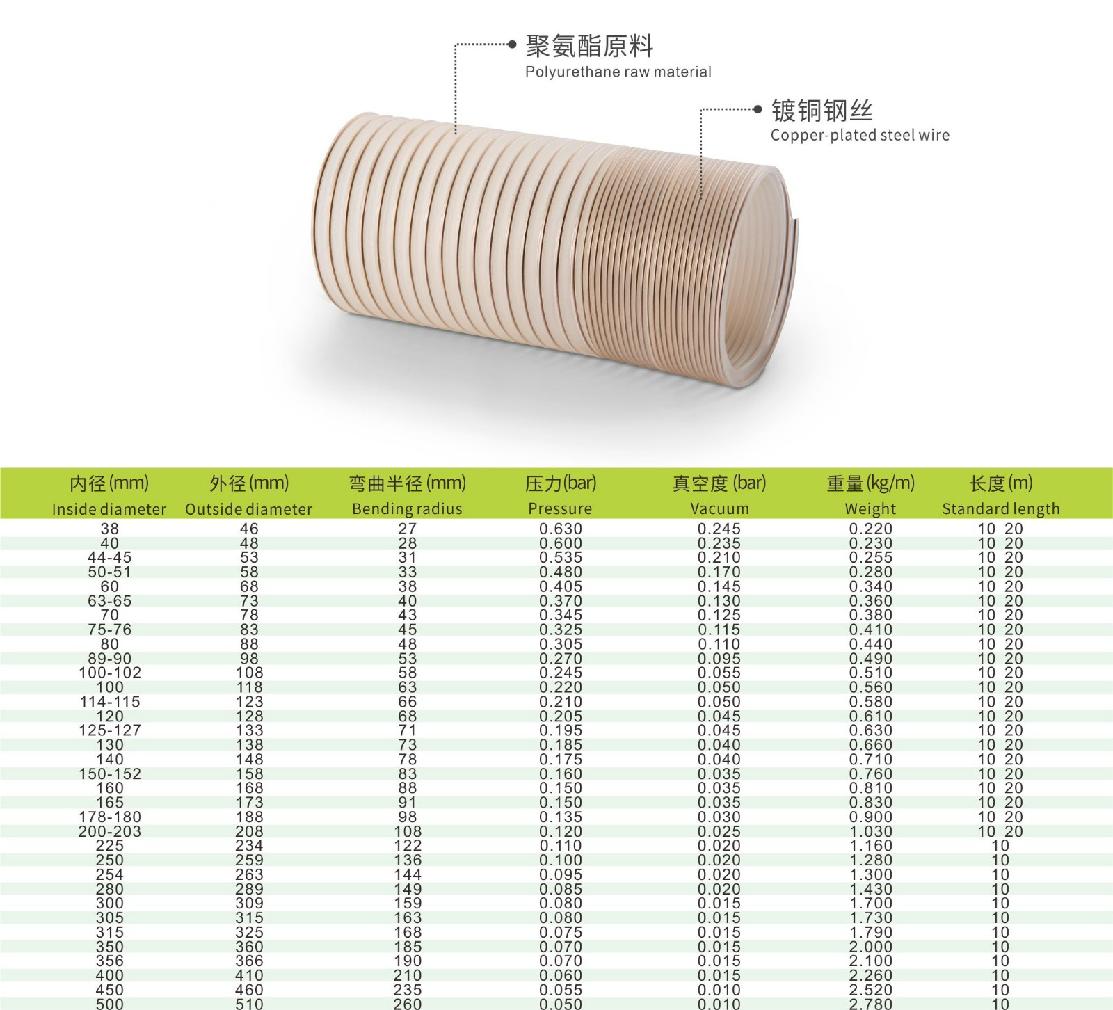 优质的聚氨酯原料,内嵌镀铜钢丝加工而成。接地排静电,耐磨损,可达PVC软管的5-10倍,良好的抗化学性能,伸缩比为3:1,壁厚度约为0.4mm。