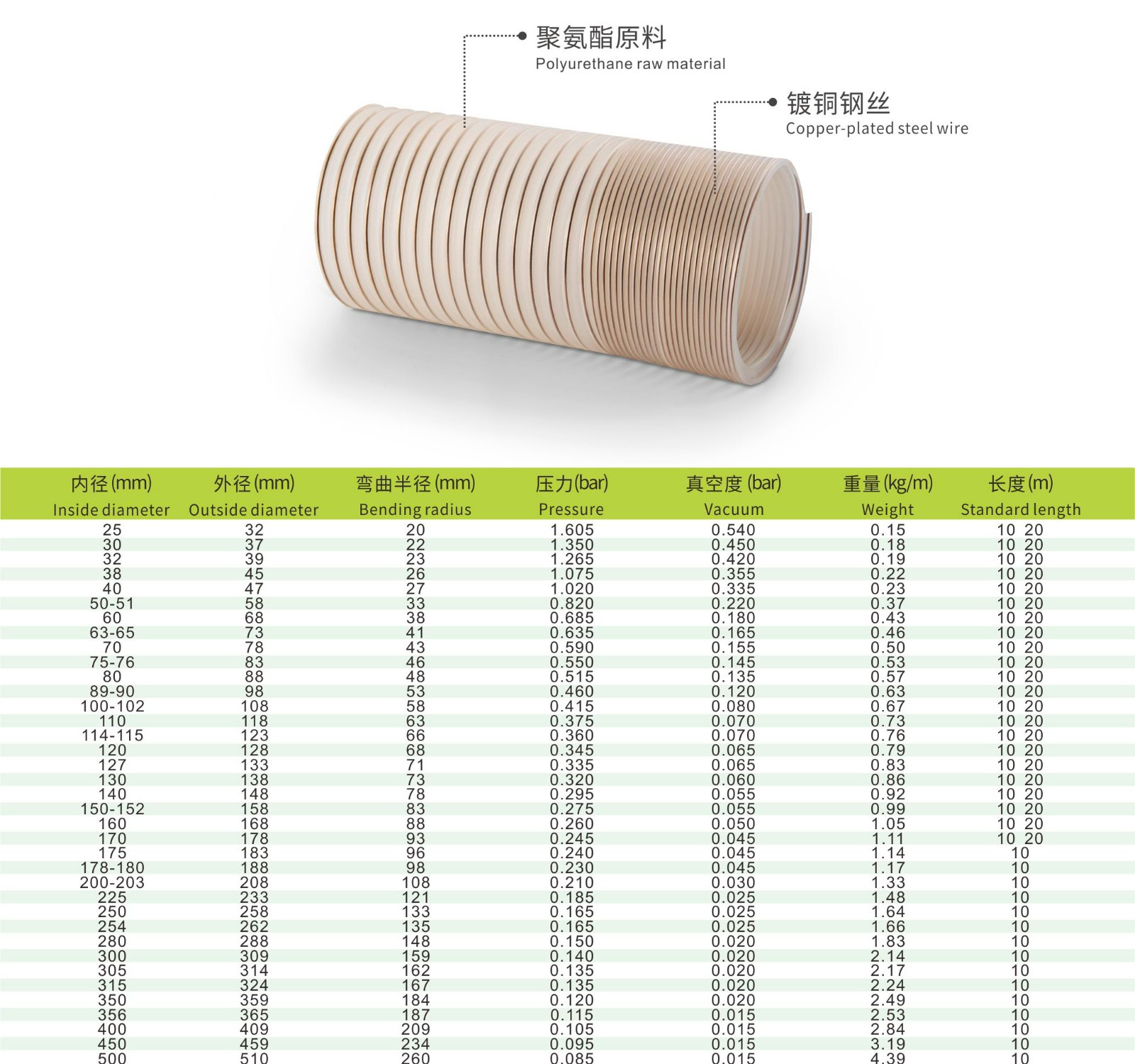 优质的聚氨酯原料,内嵌镀铜钢丝加工而成。接地排静电,中等重型、高抗磨损、耐微生物,压缩比1:3,管壁厚度约为0.6mm。