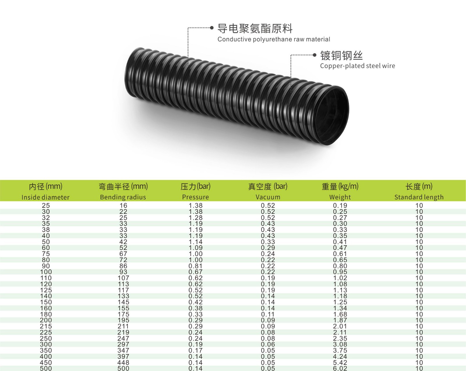 中等厚度,内壁平滑,弯曲灵活,具高拉伸、耐磨强度和断裂延伸率。无柔软剂,无卤,无害,无镉。螺旋钢丝完整地包覆于管壁,挤出带;导电管壁:电子和表面电阻值<10 Ω,特殊聚酯聚氨酯;管壁厚度约为1.0mm。