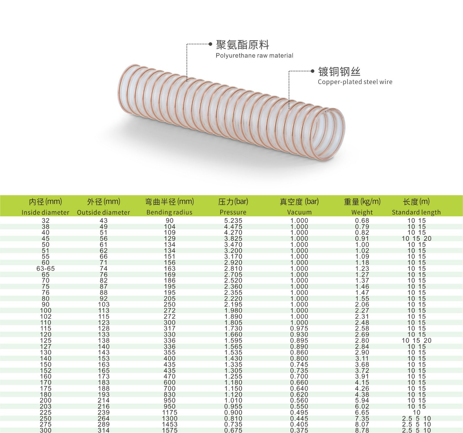 重型软管,内壁平滑,弯曲灵活,具高拉伸、耐磨强度和断裂延伸率。无柔软剂,无卤,无害,无镉。螺旋钢丝完整地包覆于管壁,挤出带;管壁:特殊聚酯聚氨酯;管壁厚度约为2.5mm。
