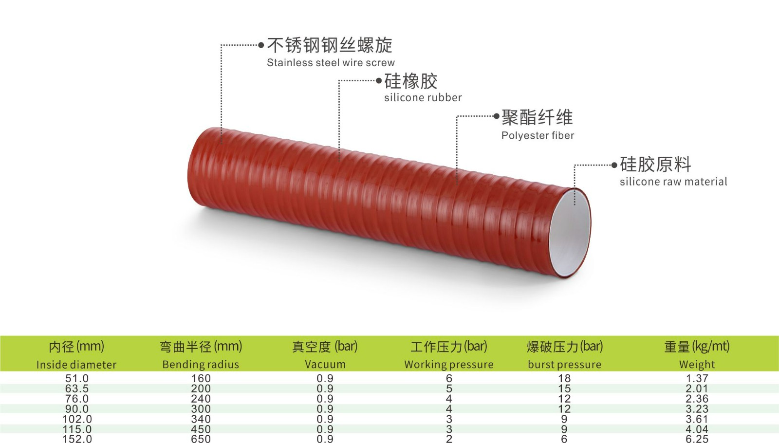 外层:宽波纹,红色,硅橡胶,耐热,耐老化,耐臭氧和耐磨,光泽面。