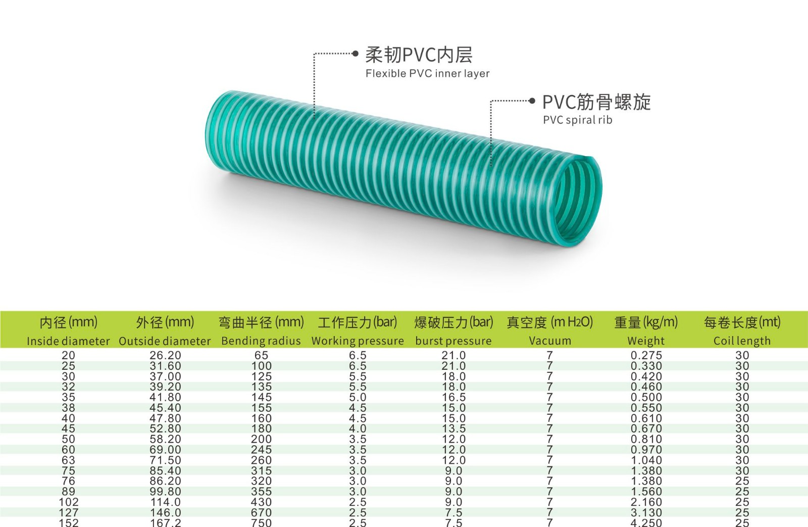中型PVC软管,硬质PVC筋⻣螺旋,表⾯平滑。