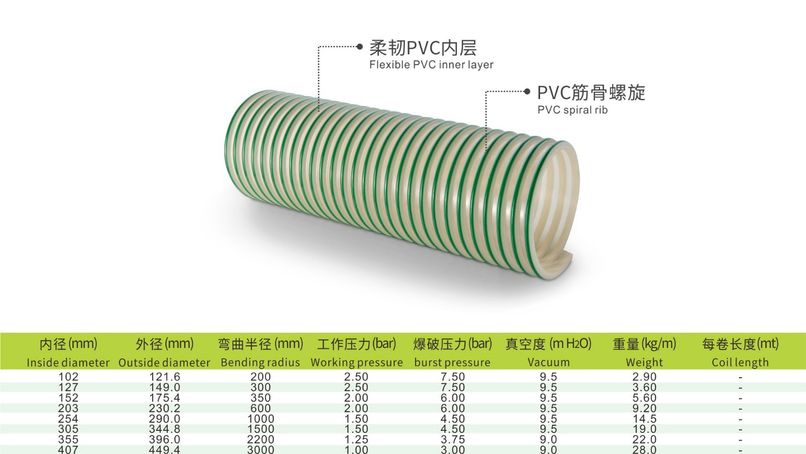 抗震型PVC软管,硬质PVC筋⻣螺旋,内壁光滑,耐真空强。