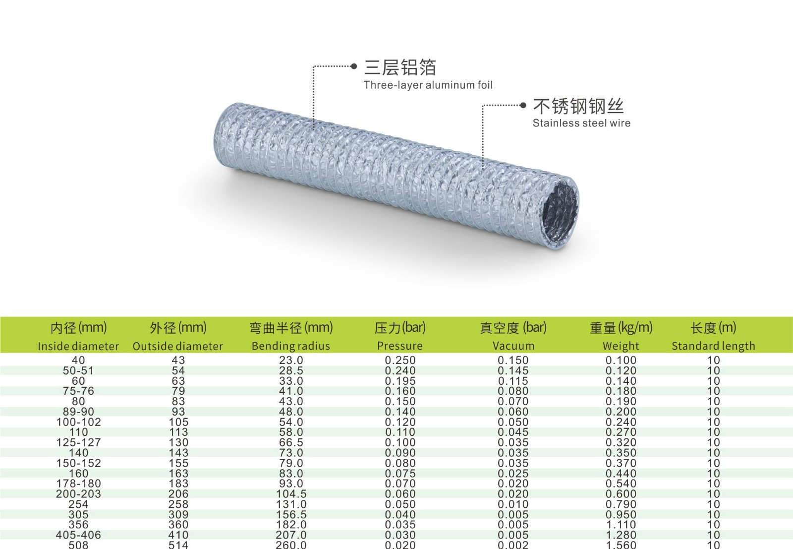 软管由三层铝箔制成,内嵌钢丝增强。