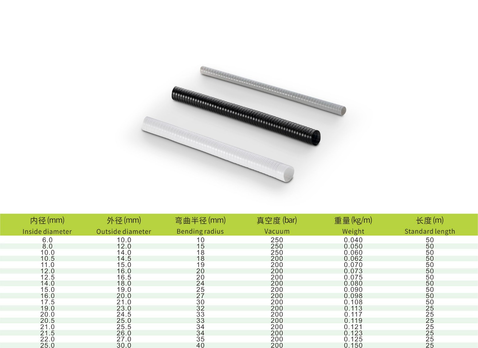 双层管壁,轻且弯曲非常灵活的PVC软管,内外壁平滑,两个PP丝螺旋加强且轴向有纱线进行加强。